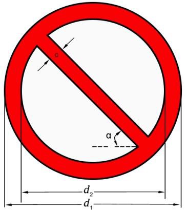A.1.1 禁止标识基本式样及制作 凡是禁止、停止和有危险的器件或环境均应使用红色的禁止标识。禁止标识的基本型式是带斜杠的圆边框,基本型式及参数见图A.1。