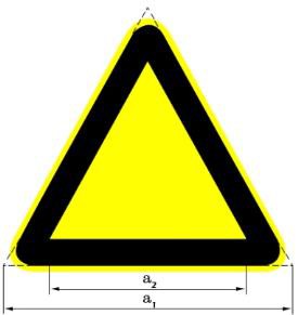 A.1.2 警告标识基本式样及制作 凡是警告工作人员的器件、设备及环境都应使用黄色的警告标识,以避免可能发生的危险。警告标 识的基本型式是正三角形边框,基本型式及参数见图A.2。