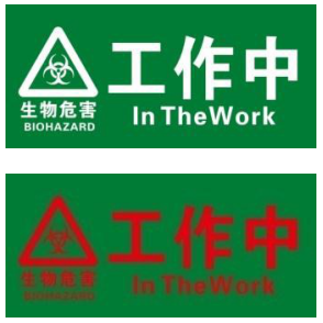 | 5-4 | ![]() | 工作中 In the work | J | 需要表明实验室处于工作状态的醒目位置,如实验室主入口或防护区入口等处(可辅助以灯箱使用) |